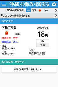 沖縄の天気予報・満潮干潮予報などの生活に役立つ情報から、いざというときに役立つ、年中行事・旧暦・六曜の情報も気軽に入手できます。-